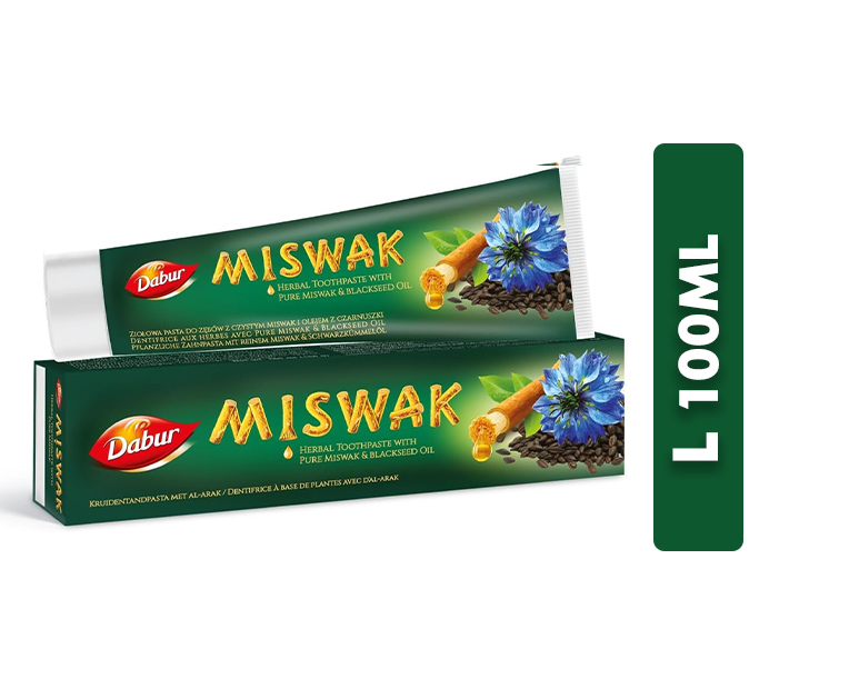 Bylinná zubná pasta Dabur Miswak so semiačkami Čiernej rasce je vedecky zložená z čistého al-Araku – slávneho stromu používaného po stáročia na zubné kefky a Čiernej rasce, ktoré je už od staroveku známe svojimi antibakteriálnymi vlastnosťami. Je dobre známe, že al-Arak a Čierna rasca poskytujú svieži dych, rastú silné, zdravé zuby od korienkov a znižujú krehkosť zubov.